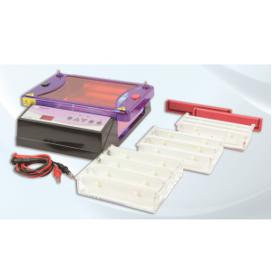 Horizontal gel electrophoresis tanks are essential laboratory devices used to separate DNA or RNA fragments based on size. In this system, a gel, typically made from agarose, is cast horizontally and submerged in a buffer solution within the tank. The samples are loaded into wells at one end of the gel, and an electric current is applied across the gel, causing the nucleic acids to migrate towards the positive electrode. Smaller fragments move faster, enabling separation by size. Horizontal tanks are ideal for analysing DNA or RNA in applications such as genetic fingerprinting, PCR product analysis, and cloning experiments. These tanks are widely used in molecular biology labs due to their ease of use, efficiency, and reliability in visualising and comparing nucleic acid samples.