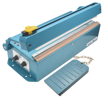 Heat sealer Hulme Martin HM 1300 CD seal length 340mm, seal width 3mm, with a cutter function, foot operated (via chain & pedal), dimensions 454mm (L) x 190mm (W) x 190mm (H), with dual electronic timer
