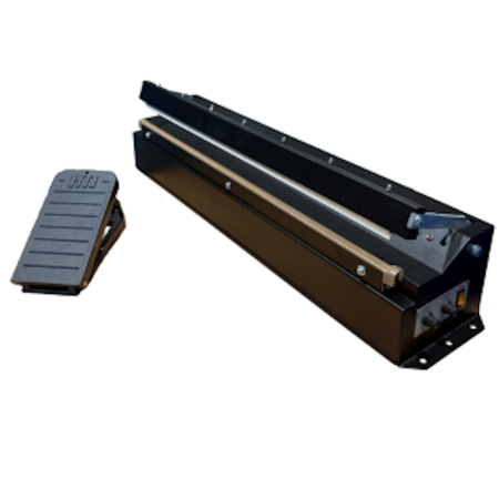 Heat sealer Hulme Martin HM 6500 DL seal length 660mm, seal width 3mm, foot operated (via chain & pedal), dimensions 851mm (L) x 180mm (W) x 190mm (H), with dual electronic timer and cable operated foot pedal