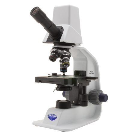 Microscope Optika B-150D-MRPL standard, monocular head type, maximum magnification 400X, not capable of fluorescence, X-LED light source, camera included, mechanical stage included, supplied with 4x, 10x and 40x magnification N-PLAN objectives for bright field, suitable for education, life science, industry, laboratories, water analysis, breweries and veterinary use (replaces part numbers B-150DM and B-150DMR)