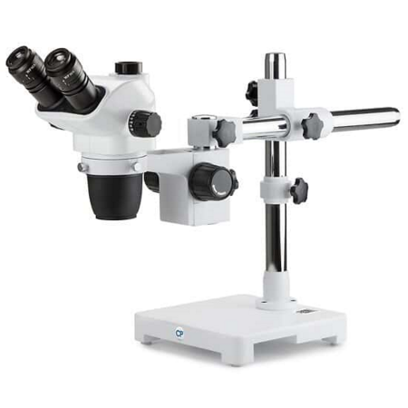 Microscope Cole-Parmer MSS-400 stereo type, trinocular head type, maximum magnification 55X, not capable of fluorescence, single arm stand type, no LED light source, camera not included, no mechanical stage, achromatic objective type, 0.65x to 5.5x zoom objective, suitable for laboratories, material science and water analysis. Includes dust cover.