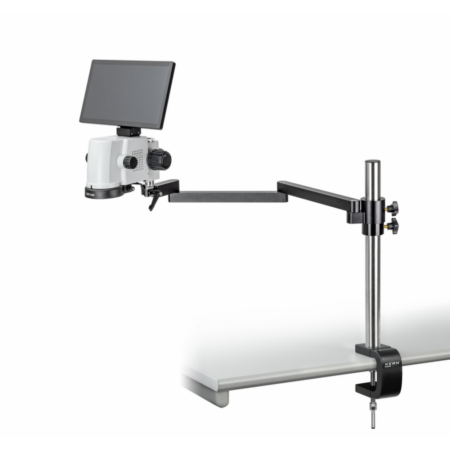 Microscope Kern and Sohn OIV 901, standard, camera head type, maximum magnification 4.5X, not capable of fluorescence, stereo universal stand with hinged arm for clamping onto the edge of the bench, LED light source, camera included, mechanical stage included, CMOS objectives, suitable for education