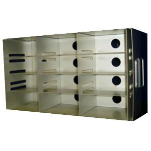 Rack side opening for 2 or 3 inch cryoboxes dimensions 235h x 137w x 420d mm fitted with adjustable shelves rack can hold 12 x 2 inch boxes or 9 x 3 inch boxes in individual compartments