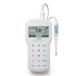 pH and temperature meter Hanna Instruments HI-98161 portable, minimum pH -2.000, maximum pH 20.000, 5 calibration points, minimum temperature -20.0°C, maximum temperature 120.0°C, PC connectivity with cable included, standard probe included (FC2023), includes 1 x pH 4.01 buffer solution (HI-7004M), 1 x pH 7.01 buffer solution (HI-7007M), 2 x electrode cleaning solution for dairy products sachets (HI-700641), 2 x 100ml plastic beakers, 4 x batteries, 1 x PC software (HI-92000), 1 x USB cable (HI-920015), and 1 x hard carrying case (HI-720161)