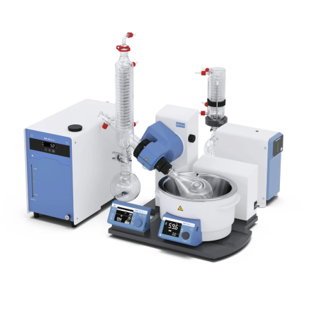Rotary evaporator IKA England RV 10 auto V Starter Solution, vertical coil condenser, for use under vacuum, 9 mbar ultimate vacuum, manual flask lift, no safety coating on glassware, with automatic boiling point detection and patented volume controlled distillation. Package includes RV 10 digital FLEX, RV 10.1 Glassware vertical, vacuum pump VACSTAR lite, RV 10.400 Stand, RC 2 lite, RV 10.5005 Set of hoses, PC 1.3 Cable. Product must be registered with IKA to extend the warranty to 5 years