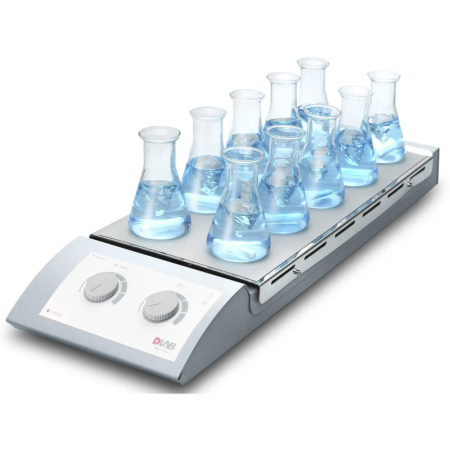Hotplate stirrer DLab MS-H-S10, 0.4L x 10 capacity, maximum plate temperature 120°C, stainless steel plate with silicone film plate, analogue control, 10 positions, plate dimensions 180w x 450d mm, no timer