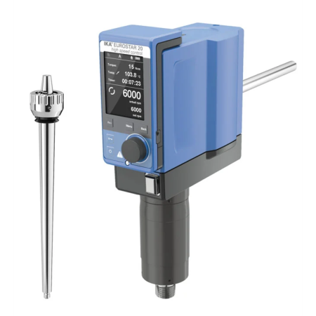 Stirrer overhead IKA England EUROSTAR 20 high speed control max capacity 20l, stirrer speed 150 to 6000 rpm, digital control, with TFT speed display, includes precision shaft 280mm long with immerson depth 220mm