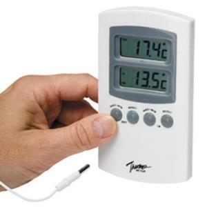 ATP TH-968 thermometer from Wolflabs. Simultaneous monitoring of two environments, suitable for indoor/outdoor use. The thermometer has 2 sensors & each sensor has its own readout. One sensor is inside the unit. The external sensor is water resistant with a 3 metre connection lead. The min/max memory operates independently for each sensor.