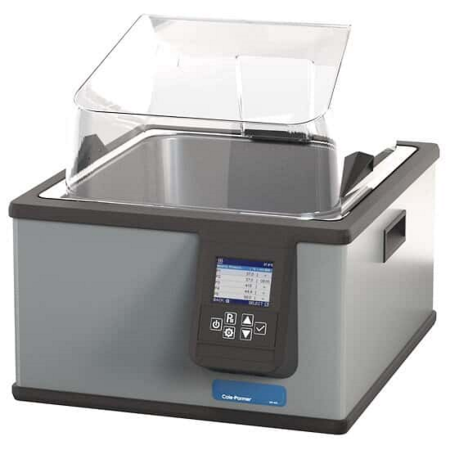 Water bath unstirred Cole-Parmer WB-400 maximum temperature 100°C, minimum temperature 26°C, stability 0.2+/-°C, 10L capacity with digital display, drain, timer and calibration, includes lid