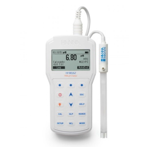pH and temperature meter Hanna Instruments HI-98162 portable, minimum pH -2.000, maximum pH 20.000, 5 calibration points, minimum temperature -20.0°C, maximum temperature 120.0°C, PC connectivity with cable included, standard probe included (FC1013), includes 1 x pH 4.01 buffer solution (HI-7004M), 1 x pH 7.01 buffer solution (HI-7007M), 2 x electrode cleaning solution for dairy products sachets (HI-700641), 2 x 100ml plastic beakers, 4 x batteries, 1 x PC software (HI-92000), 1 x USB cable (HI-920015), and 1 x hard carrying case (HI-720161)